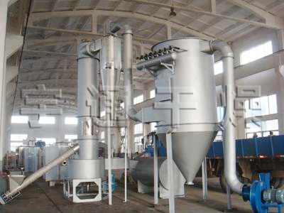 干燥采用自然風,自然風經過空氣過濾器后,由風機鼓入空氣加熱設備內被加熱,加熱后的熱風再經閃蒸主機熱風分配器,分配成均勻、一定流速、流向的旋風。旋風與螺旋加料器加入的濕物料接觸、碰撞,開始質熱交換、分離等一系列的物理變化,使得物料與所含濕份分離,終達干燥。