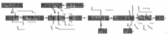 經過初、中效過濾的環境空氣由干燥系統引風機吸入熱風空氣,與蒸汽換熱后產生的熱風進入閃蒸干燥主機,與經過螺旋加料器送入干燥主機的待干燥濾餅,在干燥主機內完成傳熱傳質的干燥過程,氣固混合物由旋風分離器和布袋除塵器分離,物料被從干燥系統氣體內分離出來,排出干燥系統,尾氣由引風機排入大氣。